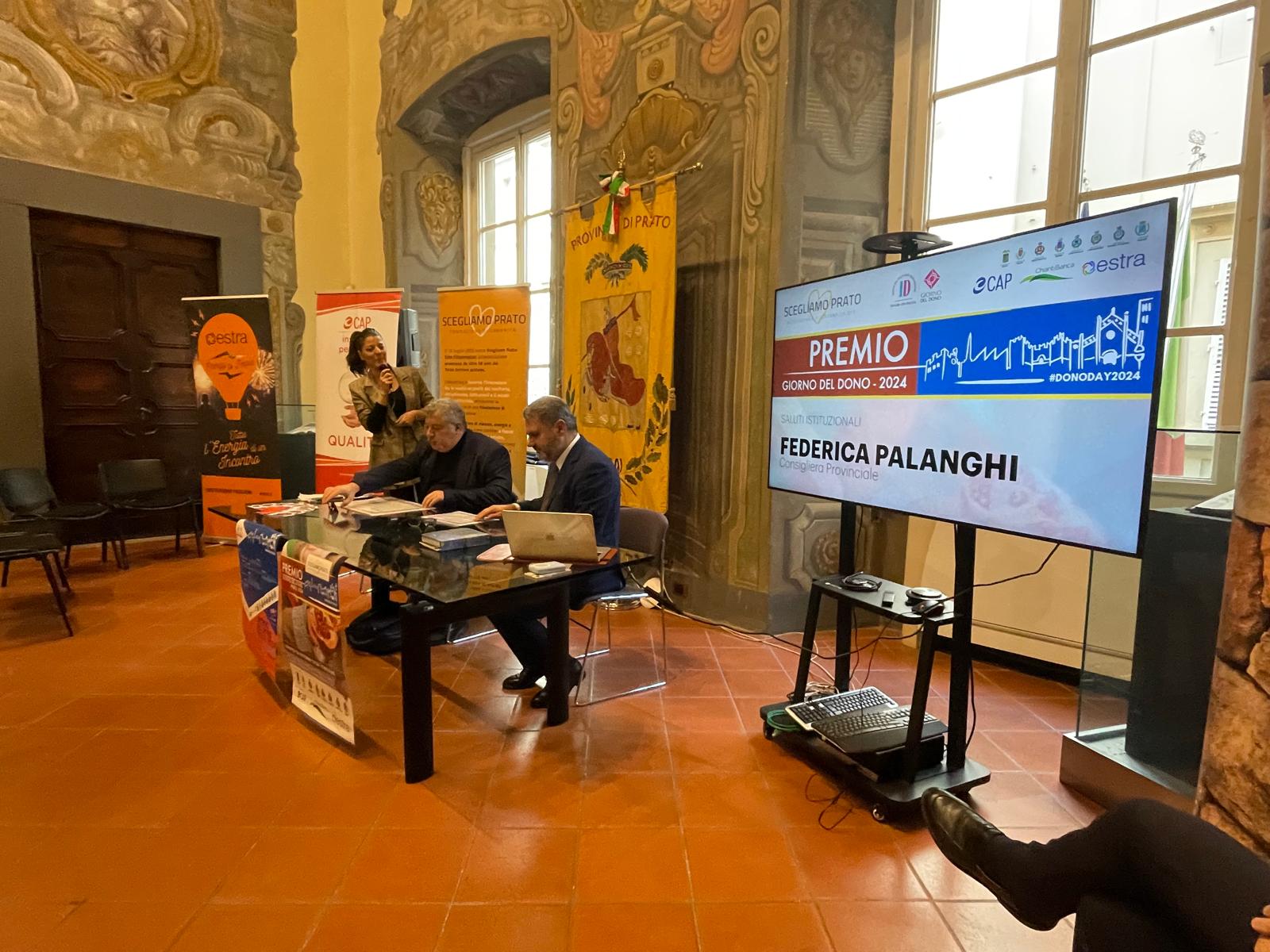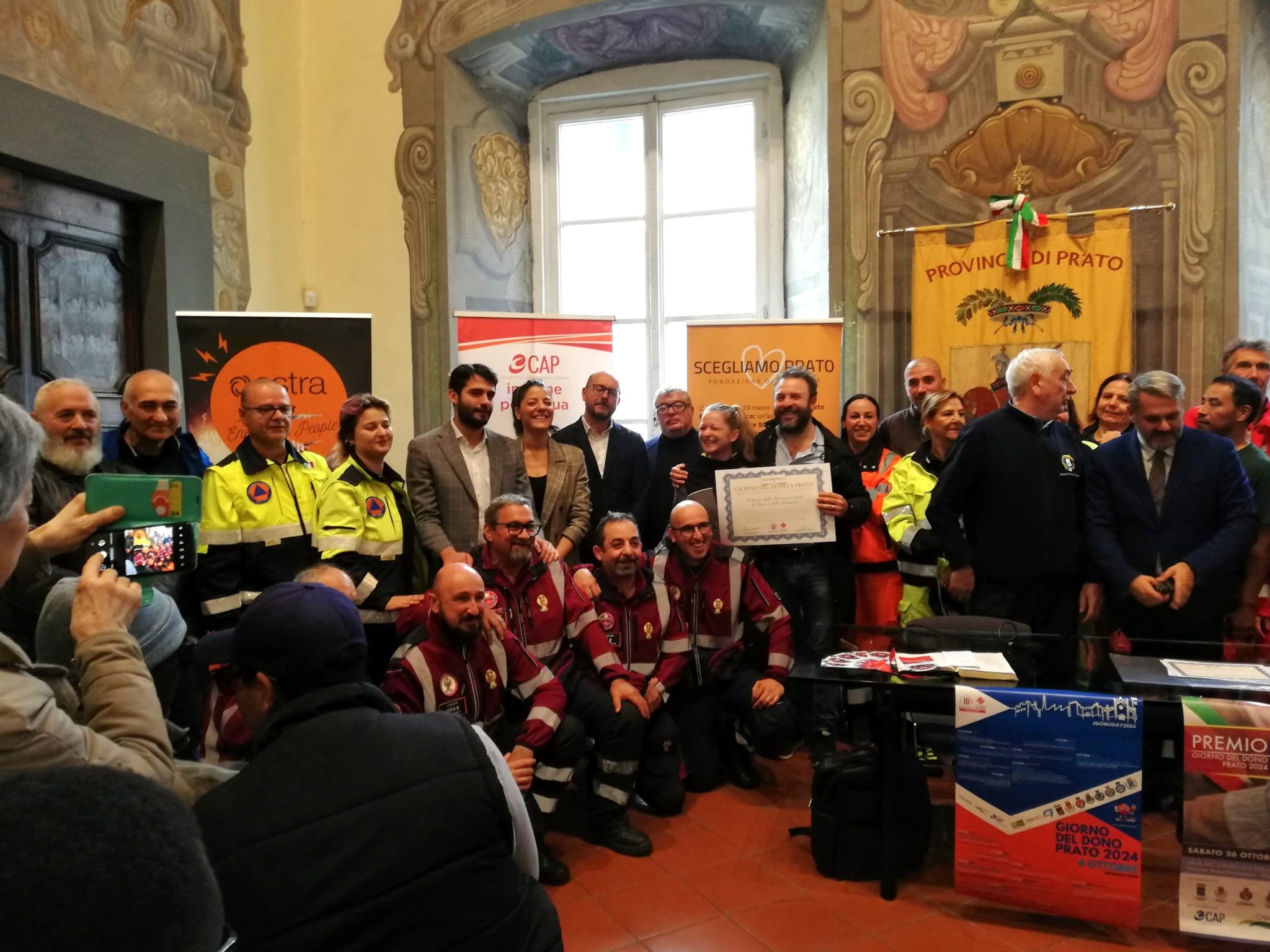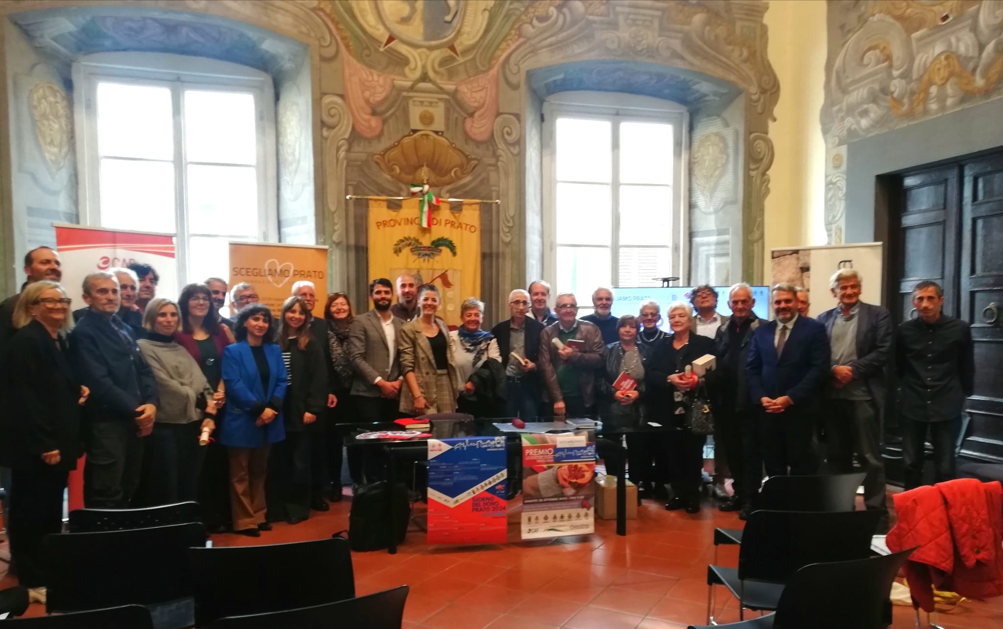 Sabato 26 ottobre, dalle ore 9, si è svolta presso la Sala del Consiglio della Provincia di Prato la cerimonia di consegna dei riconoscimenti legati all’ iniziativa “Giorno del Dono 2024” a cura dell’Associazione “Scegliamo Prato”. dopo i saluti istituzionali, la consegna dei premi alle associazioni vincitrici dell’edizione 2024 del “Premio Giorno del Dono”, premiazione della classe IVD Grafica dell’Istituto Brunelleschi di Montemurlo, consegna degli attestati di merito ai volontari della Protezione Civile attivi durante l’emergenza alluvione del novembre 2023 e ai volontari dei Circoli Arci. Con il patrocinio dei Comuni e della Provincia di Prato.