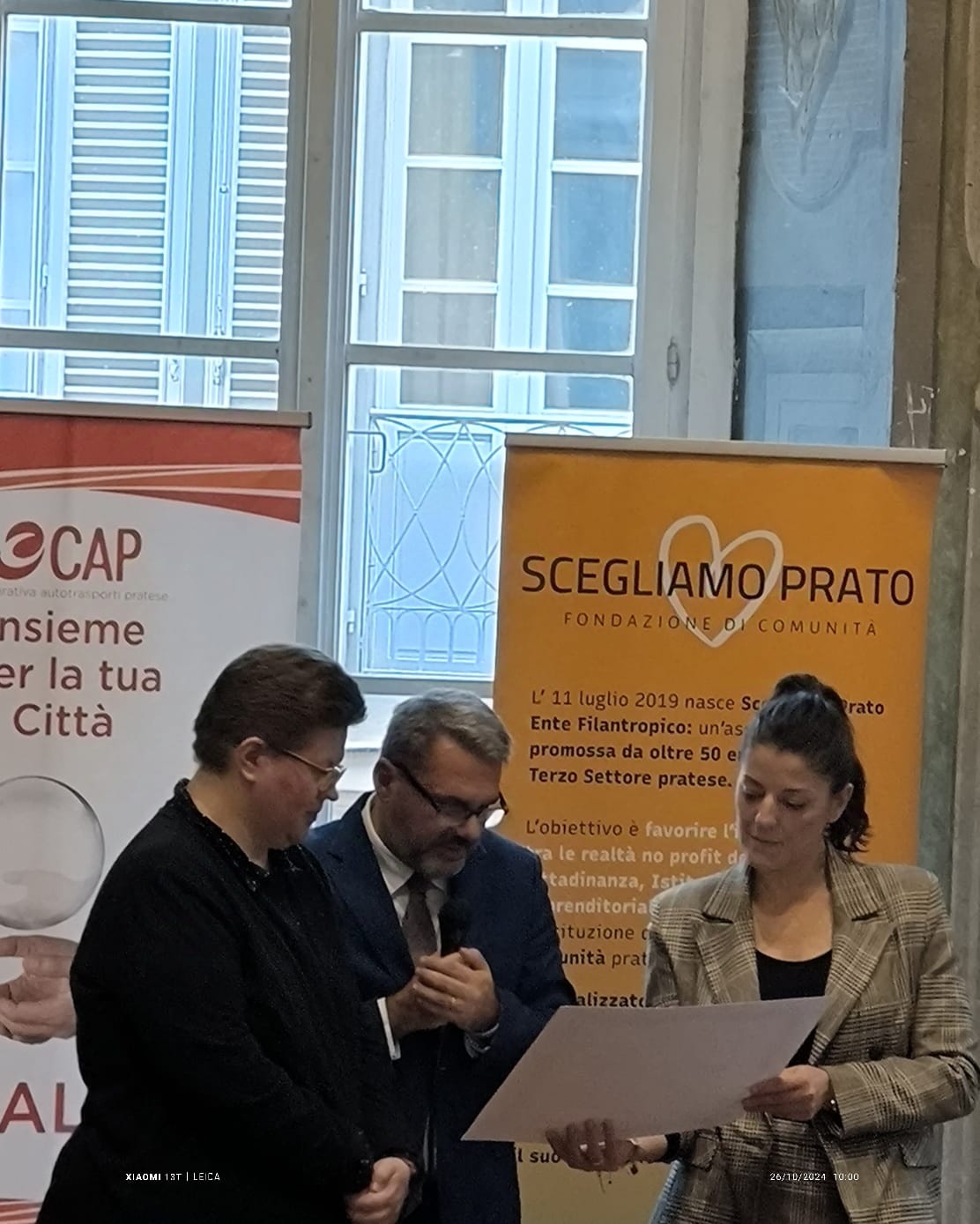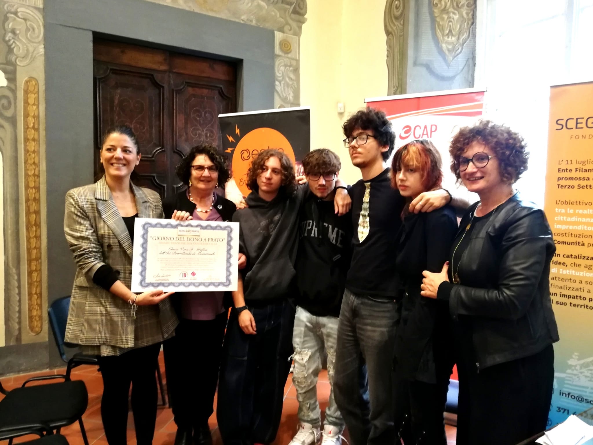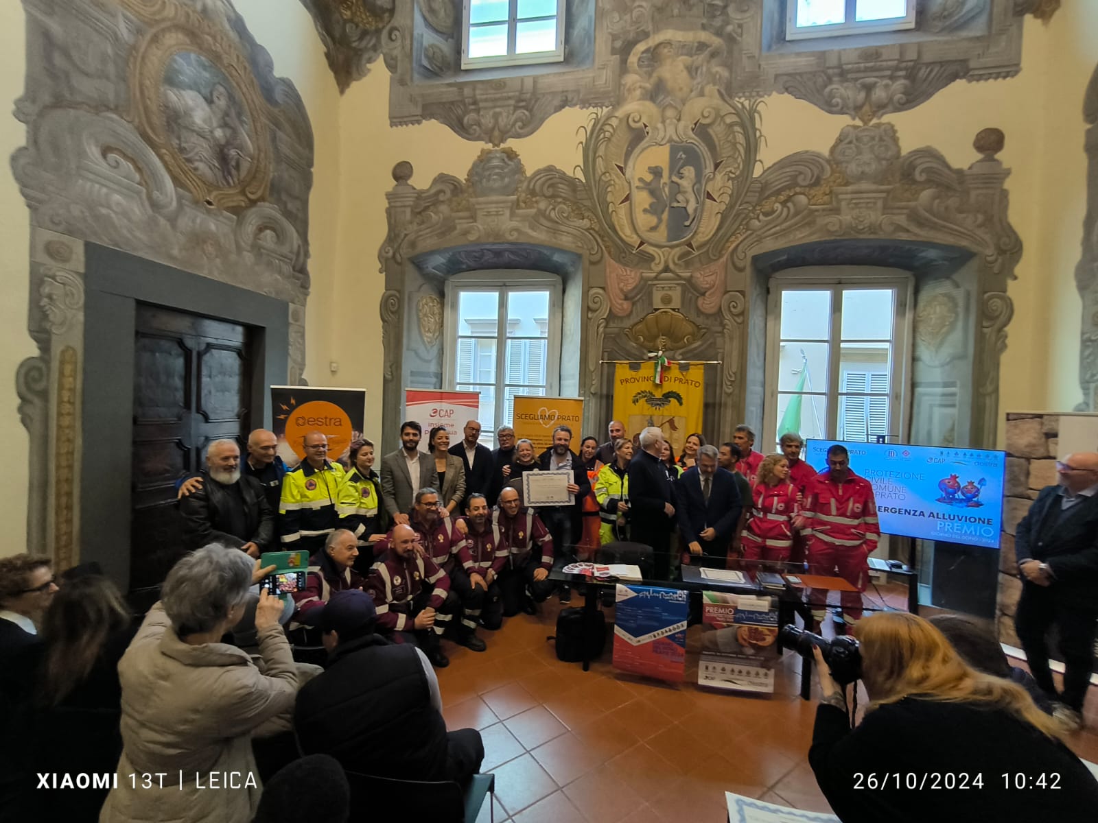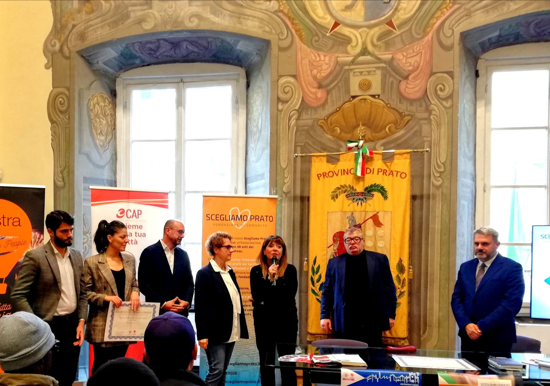 Sabato 26 ottobre, dalle ore 9, si è svolta presso la Sala del Consiglio della Provincia di Prato la cerimonia di consegna dei riconoscimenti legati all’ iniziativa “Giorno del Dono 2024” a cura dell’Associazione “Scegliamo Prato”. dopo i saluti istituzionali, la consegna dei premi alle associazioni vincitrici dell’edizione 2024 del “Premio Giorno del Dono”, premiazione della classe IVD Grafica dell’Istituto Brunelleschi di Montemurlo, consegna degli attestati di merito ai volontari della Protezione Civile attivi durante l’emergenza alluvione del novembre 2023 e ai volontari dei Circoli Arci. Con il patrocinio dei Comuni e della Provincia di Prato.